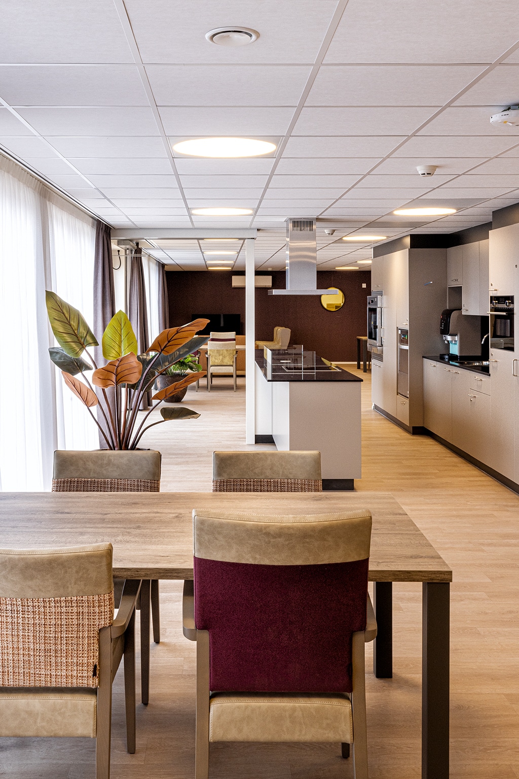 Le nouveau complexe de soins a été réalisé sur l’ordre de De Wever et conçu par le cabinet d’architectes Van Aken. Pour la conception du bâtiment, on a tenu compte de la zone boisée située à la périphérie de Tilburg. De ce fait, le complexe de soins s’inscrit pleinement dans les tons verts et bruns des environs. Des structures de lattes en bois verticales ont ainsi été posées sur les façades de l’immeuble. L’utilisation de bois crée également un look naturel et reposant.